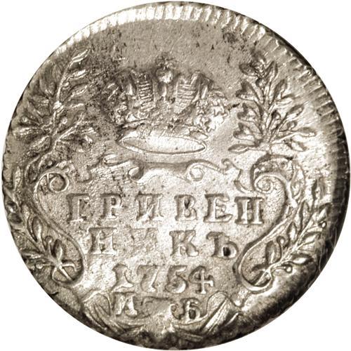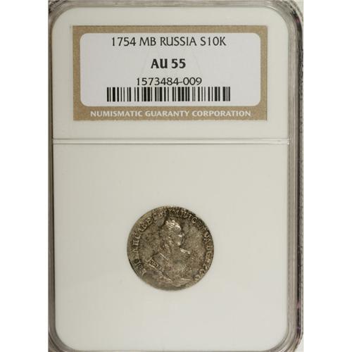 <B>Elizabeth. Grivennik (10 Kopecks) 1754 M?, Moscow,</B></I> Crowned Bust right/Crowned value and date, Bit-224, Uzd-871, AU55 NGC. A bit softly struck on the reverse with mottled toning and underlying luster.<BR><BR><b>Shipping:</b> Coins & Currency (<a target="_blank" href="http://www.heritageauctions.com/common/shipping.php">view shipping information</a>)