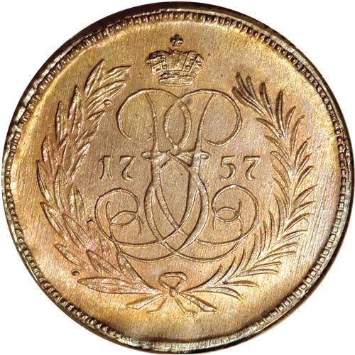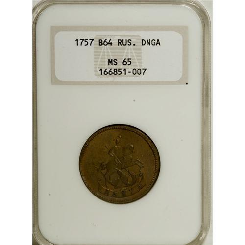 <B>Elizabeth. Novodel Denga 1757,</B></I> St. George slaying dragon/Crowned monogram and date within wreath, Brekke-65, MS65 NGC. NGC has this piece listed as a regular issue, B-64, but it is definitely a Novodel, and probably Brekke-65.<BR><I>From the Belle Glade Collection, Part Two.</B></I><BR><BR><b>Shipping:</b> Coins & Currency (<a target="_blank" href="http://www.heritageauctions.com/common/shipping.php">view shipping information</a>)