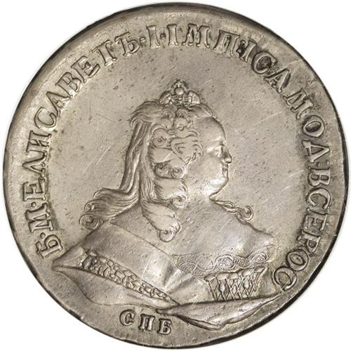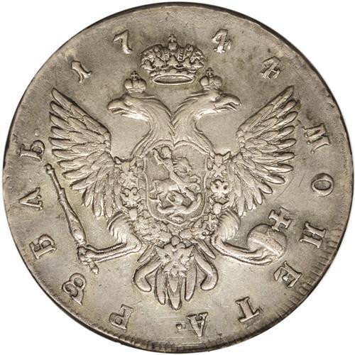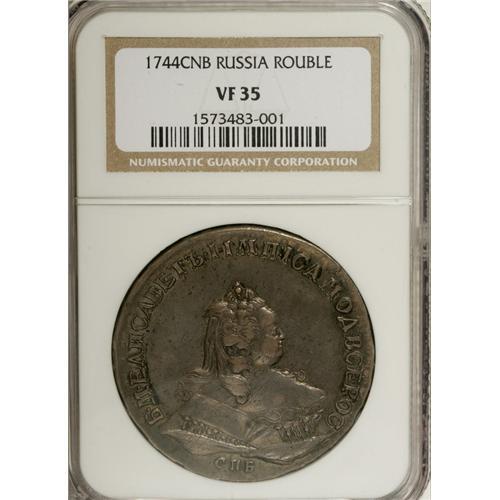 <B>Elizabeth. Rouble 1744 C??,</B></I> Crowned bust right/Imperial eagle, Bit-256, Uzd-787, VF35 NGC. Well struck with gray-brown patina and a few minor flan flaws.<BR><BR><b>Shipping:</b> Coins & Currency (<a target="_blank" href="http://www.heritageauctions.com/common/shipping.php">view shipping information</a>)