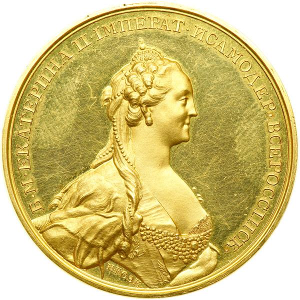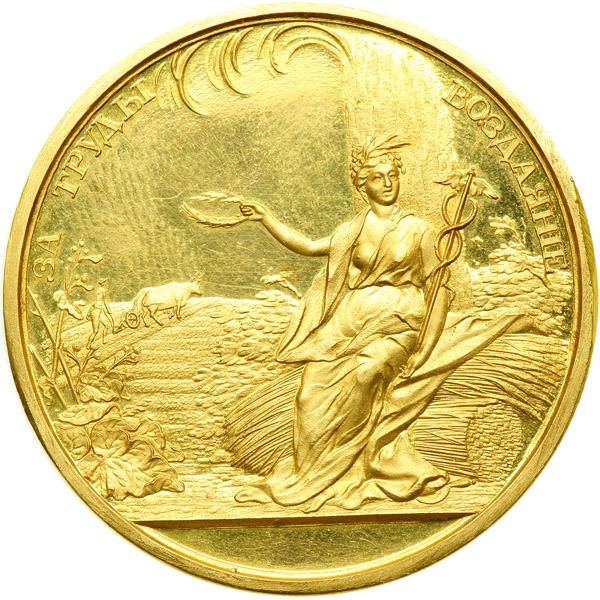 Russia. Gold Medal, ND (1786). Diakov-142.8. Gold (weight not available, in slab), 40 mm. By Н. КОЗ. К. Catherine II, The Great, 1762-1796. Liberal Economy Society award medal. Crowned and mantled bust of Catherine II right. Reverse: Under a palm tree the Goddess of harvest Ceres sitting on a sheaves of grain, holding caduceus and a wreath. In the background farmer plowing a field. Brilliant original surfaces with great eye appeal. Rare. NGC graded Uncirculated, Details (rim filing).