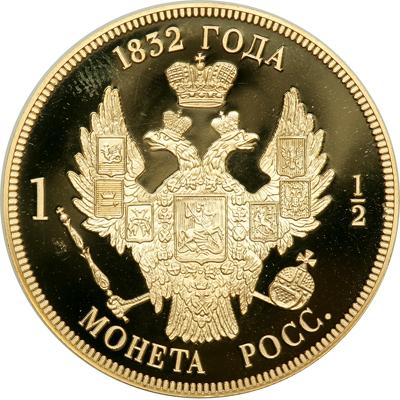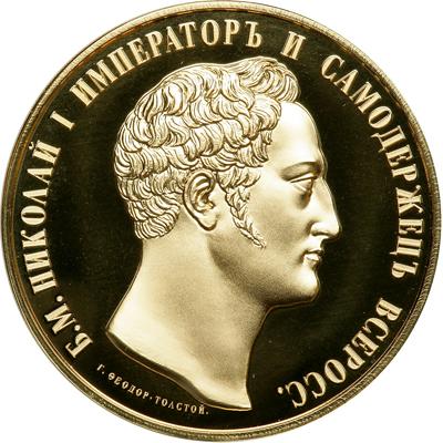 Russia. Gold Pattern 1 ½ Roubles 1832. Nicholas I, 1825-1855. Proof struck in 22ct (.916) gold. Edge plain. Diam. 38.6mm. Weight 35 grams. Obverse: Young portrait of Nicholas I after Fyodor Petrovich Tolstoi (1783-1873). Reverse features a contemporary version of the imperial, two headed eagle bearing sceptre and orb. One of only 10 pieces recently produced struck in gold. Choice Brilliant Proof.
