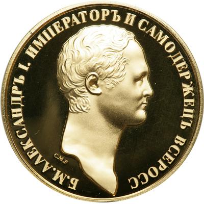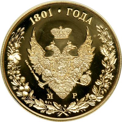 Russia. Gold Pattern 'Accession' Rouble, 1801. Alexander I, 1801-1825. Proof struck in 22ct (.916) gold. Obverse: Czar with bare head and elongated neck facing right. Reverse: Crowned imperial double headed eagle with uplifted wings within detailed wreath of fruit, leaves, wheat etc. Initials M and P to left and right of eagle. Edge plain. Diam. 38.6mm. Weight 35 grams. One of only 10 pieces recently produced struck in gold. Choice Brilliant Proof.