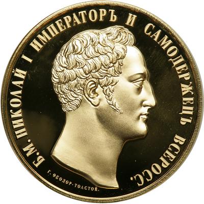 Russia. Gold Pattern 'Accession Rouble', 1825. Nicholas I, 1825-1855. Proof struck in 22ct (.916) gold. Edge plain. Diam. 38.6mm. Weight 35 grams. Obverse: Young portrait of Nicholas I after Fyodor Petrovich Tolstoi (1783-1873) facing right. Reverse features crowned imperial double headed eagle, wings down, bearing wreath and arms. MOHETA P. above 1825 below. One of only 10 pieces recently produced struck in gold. Choice Brilliant Proof.