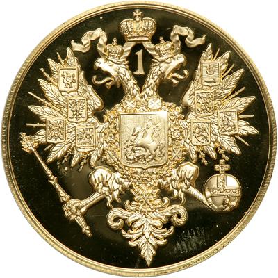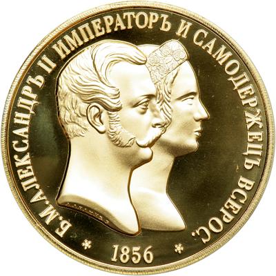 Russia. Gold Pattern 'Coronation' Rouble 1856. Alexander II, 1855- 1881. Proof struck in 22ct gold. Edge plain. Diameter 38.6mm. Weight 35 grams. Obverse: Conjoined busts of the Czar (from the portrait by A. Lyalin) and his wife Empress Maria Alexandrovna, facing right. Reverse: Detailed rendition of crowned imperial two-headed eagle with orb and sceptre, numeral 1 (Rouble) above. There were no currency roubles issued during the reign of Alexander II which bore his portrait. One of only 10 pieces recently produced struck in gold. Choice Brilliant Proof.