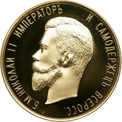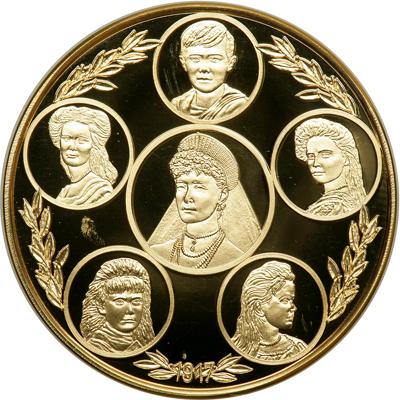 Russia. Gold Pattern 'Family' Rouble 1917. Nicholas II, 1894-1917. Proof struck in 22ct (.916) gold. Edge plain. Diam. 38.6 mm. Weight 35 grams. Obverse: Portrait of Nicholas II facing left. Reverse: Cameo portraits of the imperial family (centre) Empress Alexandra (clockwise from top) son Alexei (born 1904) daughter Tatiana (born 1897) daughter Marie (born 1897) daughter Anastasia (born 1901) and daughter Olga (born 1895) and the date 1917 below. One of only 10 pieces recently produced struck in gold. Choice Brilliant Proof.