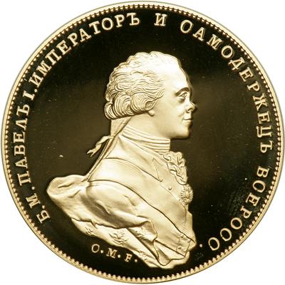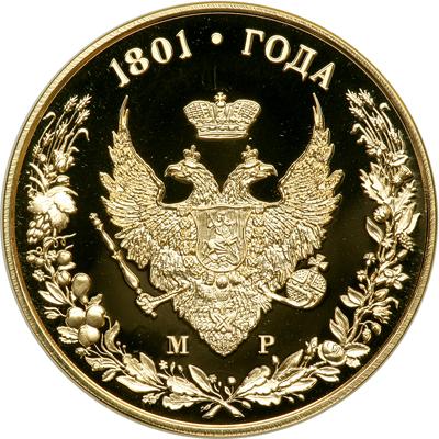 Russia. Gold Pattern Memorial Rouble 1801. Paul I,1796-1801. Proof struck in 22ct (.916) gold. Weight 35 grams. 38.6 mm diam. Edge plain. Obverse: Draped bust of Emperor right after C. Meisner. Reverse: Crowned imperial eagle holding orb and scepter. M P at sides. One of a limited edition of 10 gold pieces recently produced by the International Numismatic Agency Ltd. Choice Brilliant Proof.