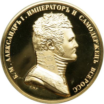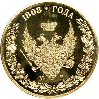 Russia. Gold Pattern 'Military' Rouble, 1808. Alexander I, 1801-1825. Proof struck in 22ct (.916) gold. Edge plain. Diam. 38.6mm. Weight 35 grams. Obverse: Czar facing right with military uniform. Reverse: Crowned imperial double headed eagle with uplifted wings within detailed wreath of fruit, leaves, wheat etc. Initials M and P to left and right of eagle. One of only 10 pieces recently produced struck in gold. Choice Brilliant Proof.