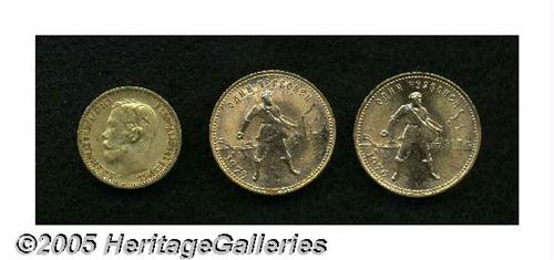 <B>Gold trio including:</B></I> 5 Rubles 1898 XF; Chervonetz (10 Rubles) 1975, BU; and a Chervonetz 10 Rubles (1976), BU.