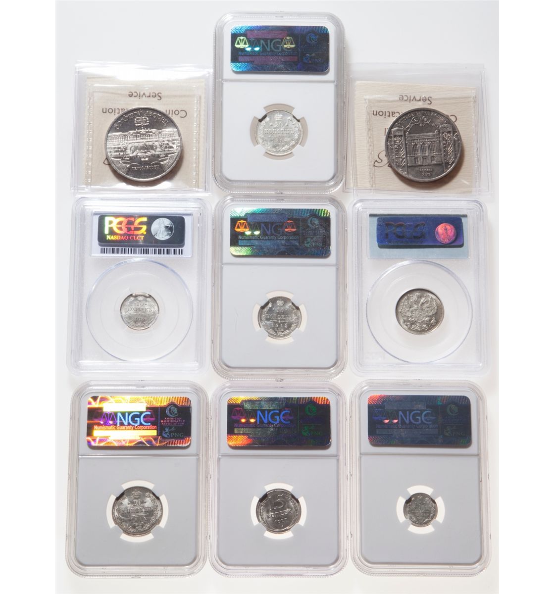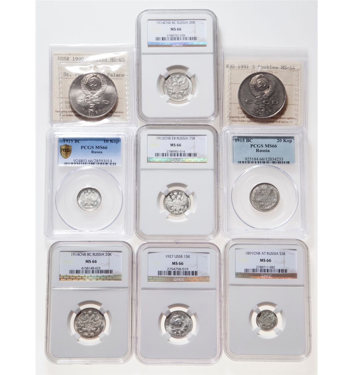 Russia. Lot of nine (9) mostly Gem certified coins, including: 5 Kopecs 1891 CNB, NGC MS-66; 10 Kopecs 1915 BC, PCGS MS-66; 15 Kopecs 1912 CNB EB, NGC MS-66; 15 Kopecs 1927, NGC MS-66; 20 Kopecs 1914 BC, NGC MS-66; 20 Kopecs 1914 BC, NGC MS-66; 20 Kopecs 1915 BC, PCGS MS-66; 5 Roubles 1990, ICCS MS-65; 5 Roubles 1991, ICCS MS-64.