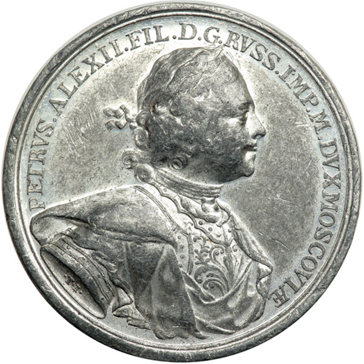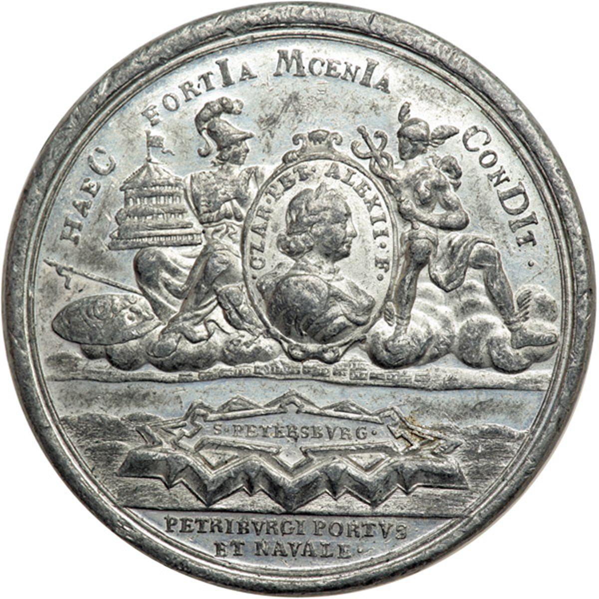 Russia. Medal, 1703. Diakov-18.6; Tiregale-14; Iverson XVI/Ic. Struck in White Metal. 46.5 mm. by T. Ivanov. Peter I. Founding of St. Petersburg. Bust of Peter right. Reverse: Pallas and Mercury holding medallion of Peter over view of city. Very Fine to Extremely Fine.