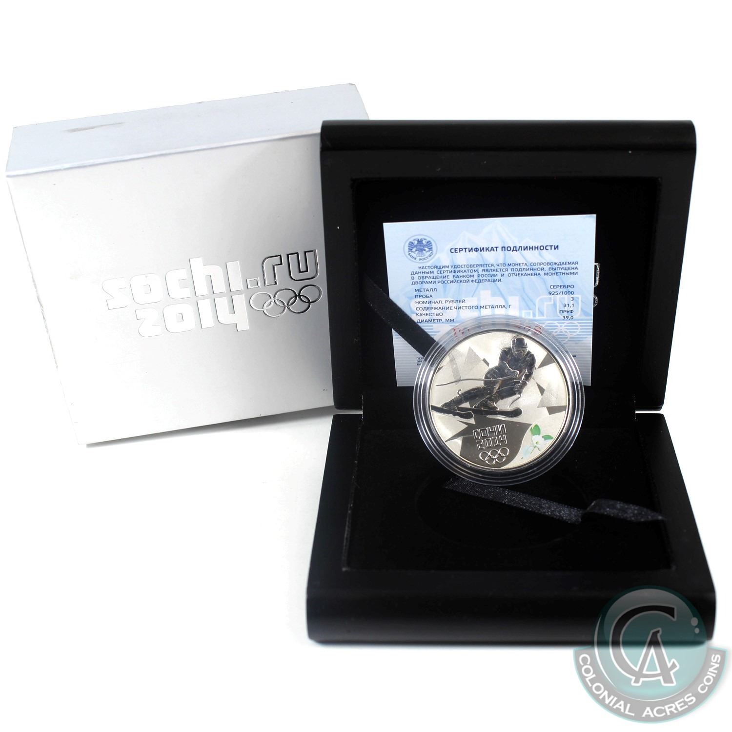 Russia Mint Issue: 2014 Sochi Olympics 3 Roubles Alpine Skiing Sterling Silver Proof Coin. (coin contains natural toning and display box is lightly scuffed)