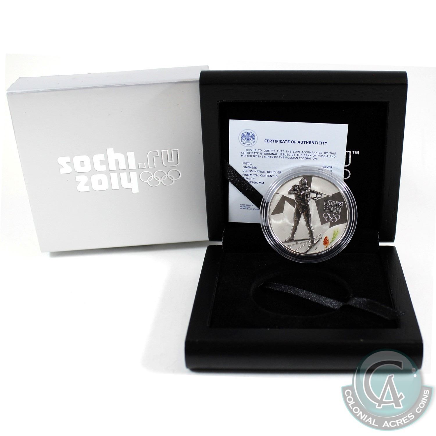 Russia Mint Issue: 2014 Sochi Olympics 3 Roubles Biathlon Sterling Silver Proof Coin.
