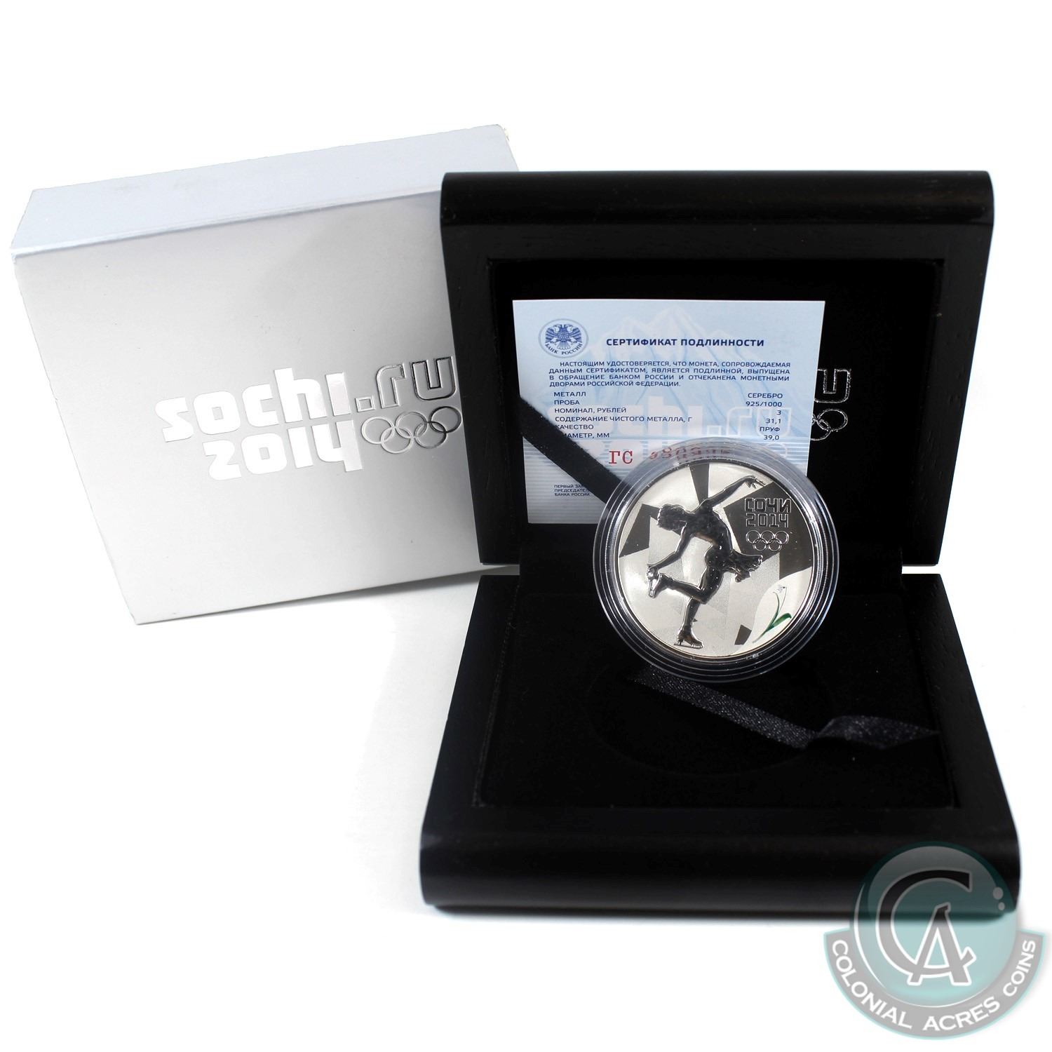 Russia Mint Issue: 2014 Sochi Olympics 3 Roubles Speed Skating Sterling Silver Proof Coin (coin contains natural toning and display box is lightly scuffed)