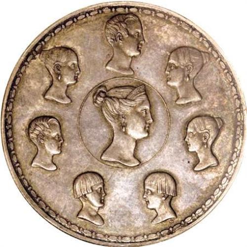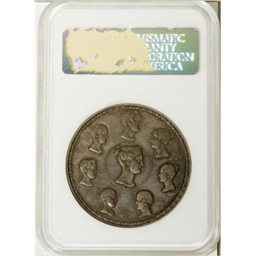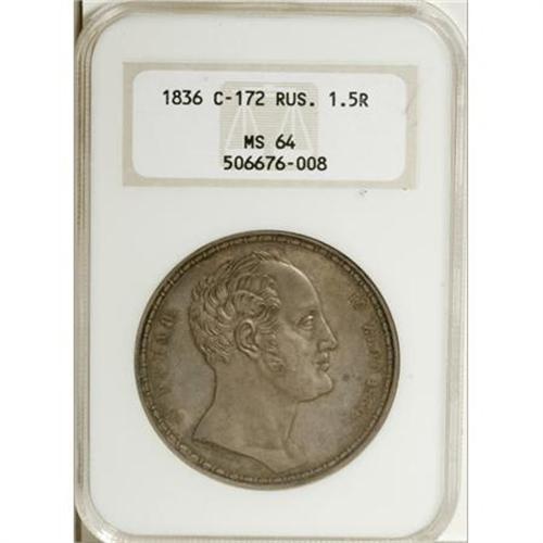 <B>Nicholas I. 1-1/2 Rouble 1836,</B></I> obverse signed ?.?., reverse unsigned, Bust of Nicholas I right/Bust of Empress Alexandra in the center, facing right, surrounded by busts of the Royal children with no circles, Bit-888, Uzd-4207, MS64 NGC. The strike is bold and the toning and attractive blend of gray and gold over prooflike surfaces. There is no sign of the edge flaw, or cud on the obverse rim between 4 and 5 oclock, therefore we feel comfortable calling this piece an original striking. This is the finest piece certified by NGC and undoubtedly one of the nicer examples extant. A rare opportunity for the collector who desires to own one of the finer examples of this prized issue. <BR><BR><b>Shipping:</b> Coins & Currency (<a target="_blank" href="http://www.heritageauctions.com/common/shipping.php">view shipping information</a>)