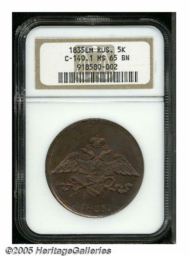 <B>Nicholas I 5 Kopecks 1835-EM,</B></I> KM-C140.1, Br-250, MS65 Brown NGC. Sharply struck with iridescent surfaces and traces of mint red color remaining.