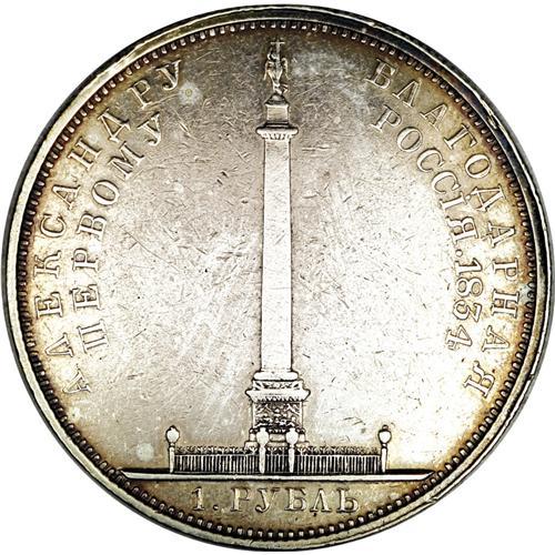 <B>Nicholas I. Alexander I Column Commemorative Rouble 1834,</B></I> by H. Gube, Bust right/Alexander I Column, Bit-894, Dav-285, XF. Harshly cleaned in the past, but time and natural toning has taken the edge off the cleaning.<BR><BR><b>Shipping:</b> Coins & Currency (<a target="_blank" href="http://www.heritageauctions.com/common/shipping.php">view shipping information</a>)