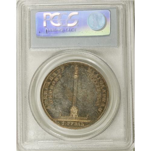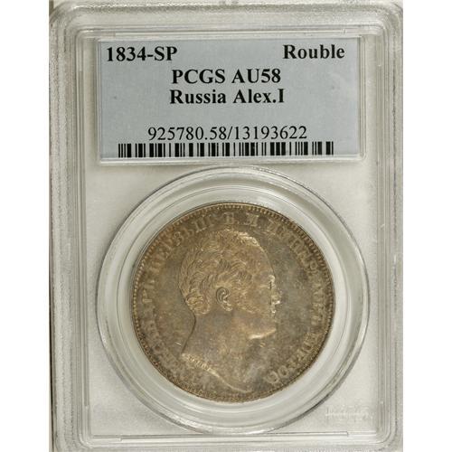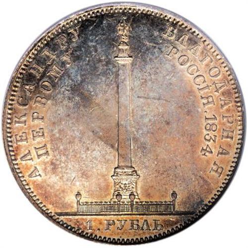 <B>Nicholas I. Alexander I Column Commemorative Rouble 1834,</B></I> by H. Gube, Bust right/Alexander I Column, Bit-894, Dav-285, AU58 PCGS. Sharply struck with mottled russet toning over prooflike fields and moderate contact marks.<BR><BR><b>Shipping:</b> Coins & Currency (<a target="_blank" href="http://www.heritageauctions.com/common/shipping.php">view shipping information</a>)