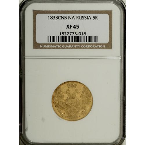 <B>Nicholas I. Gold 5 Roubles 1833 C??-??,</B></I> Crowned Imperial eagle/Date and value in circle, Bit-8, F-155, XF45 NGC. A decent strike with moderate abrasions and traces of luster.<BR><BR><b>Shipping:</b> Coins & Currency (<a target="_blank" href="http://www.heritageauctions.com/common/shipping.php">view shipping information</a>)