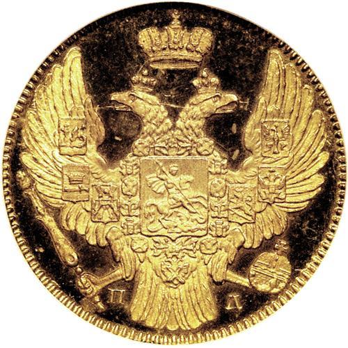 <B>Nicholas I. Gold 5 Roubles 1838 C??-??,</B></I> Crowned Imperial eagle/Date and value in circle, Bit-15, F-155, Proof 65 NGC. Frosted devices with brilliant mirrored fields. The color is a bright greenish-gold and the strike is bold. The reverse exhibits a few tiny spots, but the overall appearance is stunning for this very rare issue. Ex: Hesselgesser Collection.<BR><I>From the Belle Glade Collection, Part Two.</B></I><BR><BR><b>Shipping:</b> Coins & Currency (<a target="_blank" href="http://www.heritageauctions.com/common/shipping.php">view shipping information</a>)