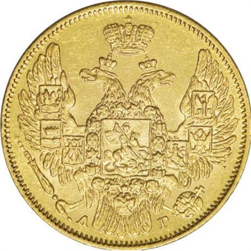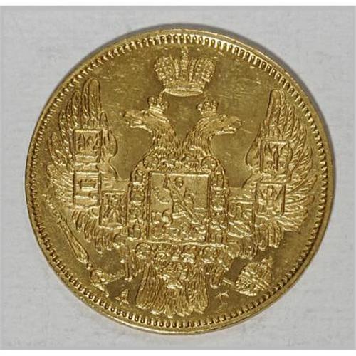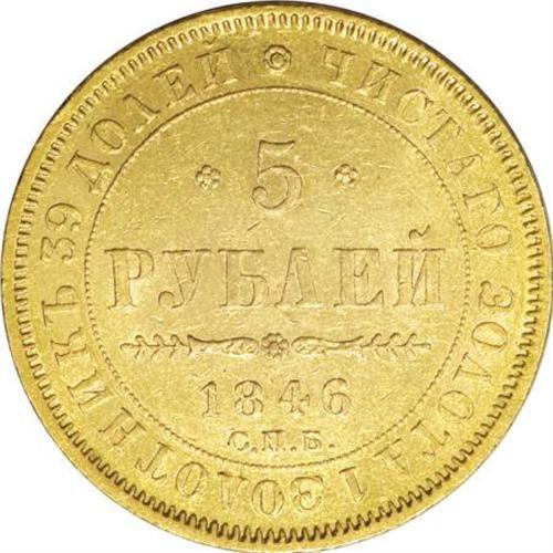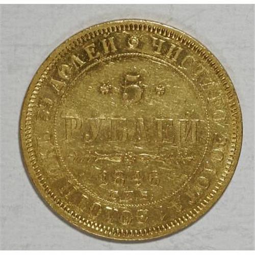 <B>Nicholas I. Gold 5 Roubles 1846 C??-A?,</B></I> Imperial eagle/ Date and value in circle, Bit-27, lustrous AU. Well struck with moderate abrasions. <BR><BR><b>Shipping:</b> Coins & Currency (<a target="_blank" href="http://www.heritageauctions.com/common/shipping.php">view shipping information</a>)