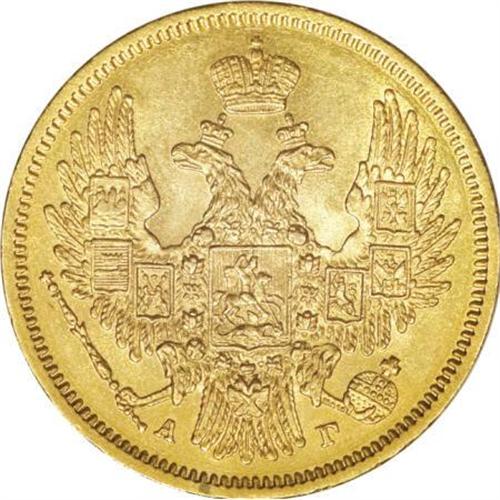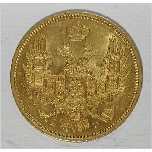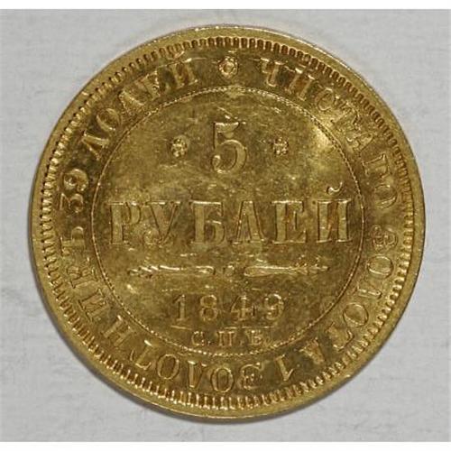<B>Nicholas I. Gold 5 Roubles 1849 C??-A?,</B></I> Imperial eagle/ Date and value in circle, Bit-31, lustrous AU with a nice strike and a few light marks on the reverse. <BR><BR><b>Shipping:</b> Coins & Currency (<a target="_blank" href="http://www.heritageauctions.com/common/shipping.php">view shipping information</a>)