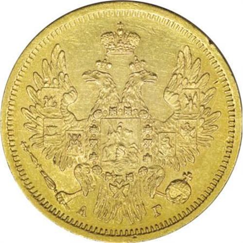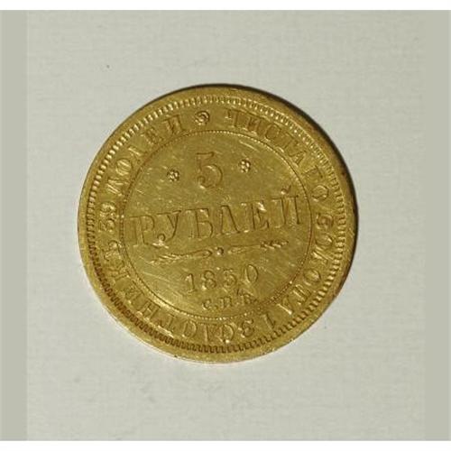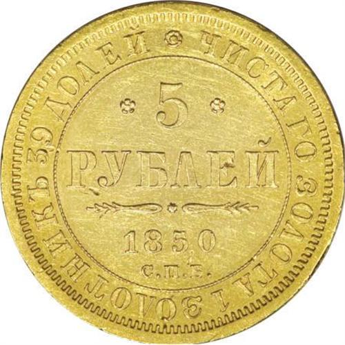 <B>Nicholas I. Gold 5 Roubles 1850 C??-A?,</B></I> Imperial eagle/ Date and value in circle, Bit-53, lustrous XF-AU with moderate contact marks. <BR><BR><b>Shipping:</b> Coins & Currency (<a target="_blank" href="http://www.heritageauctions.com/common/shipping.php">view shipping information</a>)