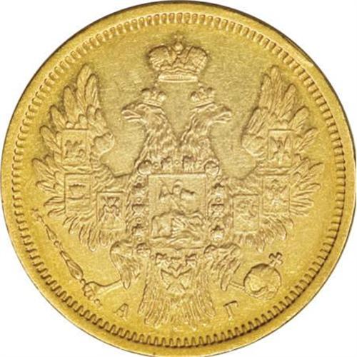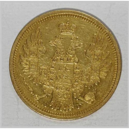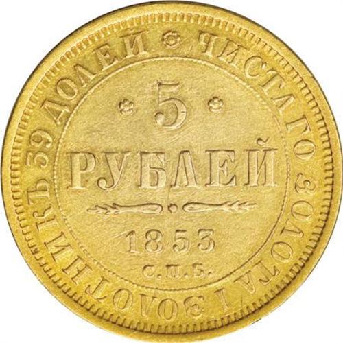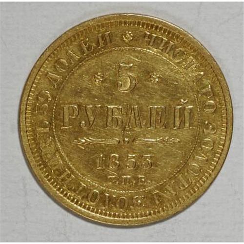 <B>Nicholas I. Gold 5 Roubles 1853 C??-A?,</B></I> Imperial eagle/ Date and value in circle, Bit-36, lustrous XF with moderate to heavy contact marks.<BR><BR><b>Shipping:</b> Coins & Currency (<a target="_blank" href="http://www.heritageauctions.com/common/shipping.php">view shipping information</a>)
