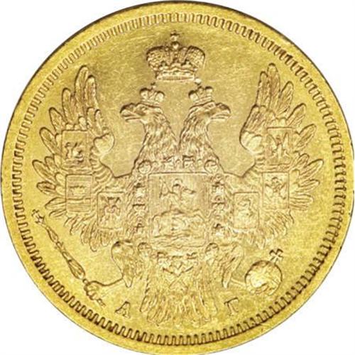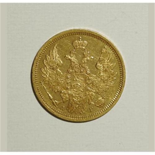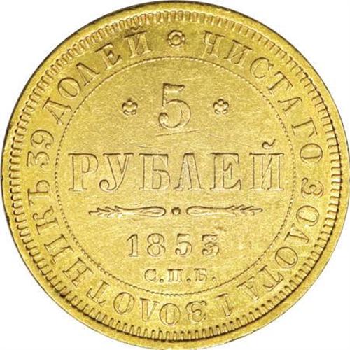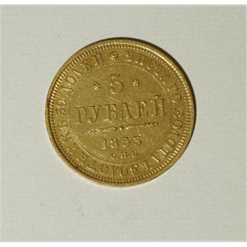 <B>Nicholas I. Gold 5 Roubles 1853 C??-A?,</B></I> Imperial eagle/ Date and value in circle, Bit-36, lustrous XF. <BR><BR><b>Shipping:</b> Coins & Currency (<a target="_blank" href="http://www.heritageauctions.com/common/shipping.php">view shipping information</a>)