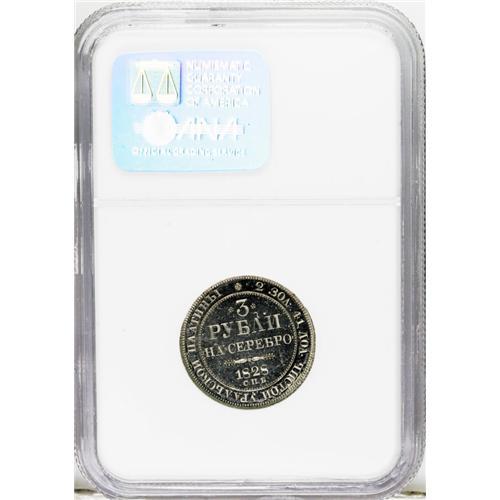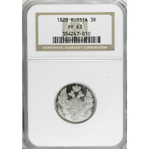 <B>Nicholas I. Platinum 3 Roubles 1828 C??,</B></I> Crowned Imperial eagle/Date and value in circle, Bit-73, F-160, Proof 63 NGC. The obverse has a distinct cameo contrast and the reverse has a noticeable flan flaw through the second P of CEPE?PO. Est. 3000-3500<BR><BR><b>Shipping:</b> Coins & Currency (<a target="_blank" href="http://www.heritageauctions.com/common/shipping.php">view shipping information</a>)