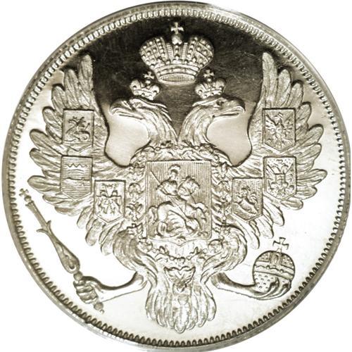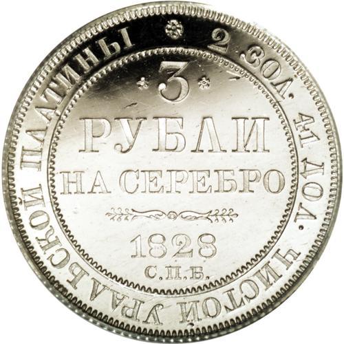 <B>Nicholas I. Platinum 3 Roubles 1828 C??,</B></I> Crowned Imperial eagle/Date and value in circle, Bit-73, F-160, Proof 64 PCGS. As the previous lot, the holder for this piece does not reflect the outstanding Cameo appearance on both sides as all of the devices are heavily frosted and the fields deeply mirrored creating a distinct Cameo appearance.<BR><I>From the Belle Glade Collection, Part Two.</B></I><BR><BR><b>Shipping:</b> Coins & Currency (<a target="_blank" href="http://www.heritageauctions.com/common/shipping.php">view shipping information</a>)
