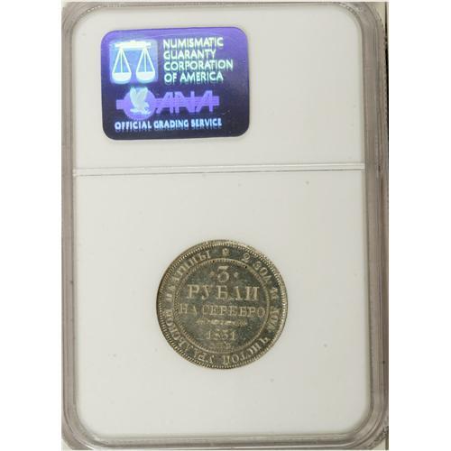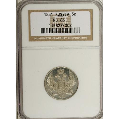 <B>Nicholas I. Platinum 3 Roubles 1831 C??,</B></I> Crowned Imperial eagle/Date and value in circle, Bit-77, F-160, MS66 NGC. Fully brilliant with prooflike surfaces and no apparent flaws. A superior Mint State example. Very rare in this condition.<BR><I>From the Belle Glade Collection, Part Two.</B></I><BR><BR><b>Shipping:</b> Coins & Currency (<a target="_blank" href="http://www.heritageauctions.com/common/shipping.php">view shipping information</a>)