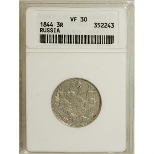 <B>Nicholas I. Platinum 3 Roubles 1844 C??,</B></I> Imperial eagle/Date and value in circle, Bit-90, VF30 ANACS. <BR><BR><b>Shipping:</b> Coins & Currency (<a target="_blank" href="http://www.heritageauctions.com/common/shipping.php">view shipping information</a>)
