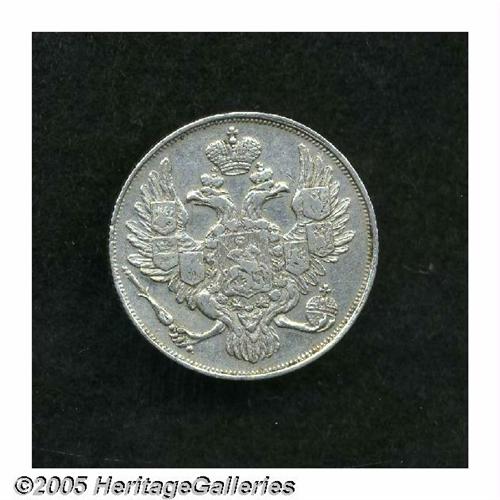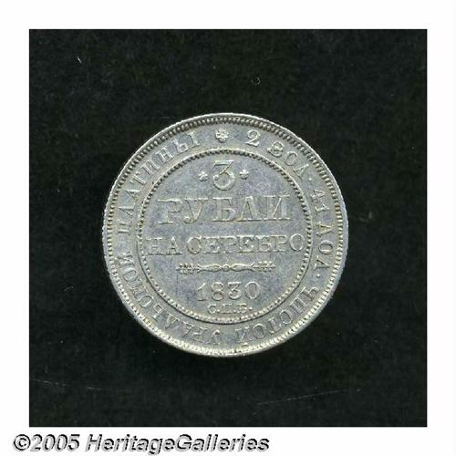 <B>Nicholas I Platinum 3 Rubles 1830 St. Petersburg,</B></I> KM-C177, XF.