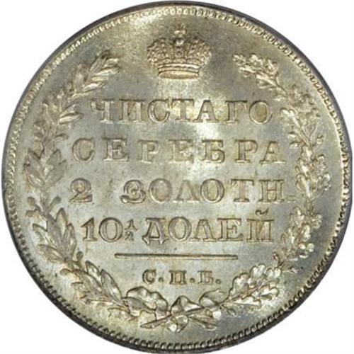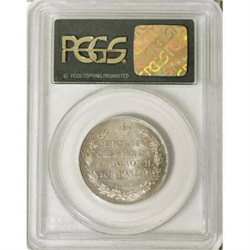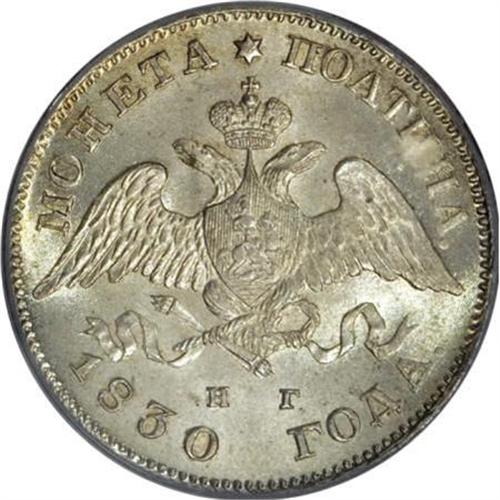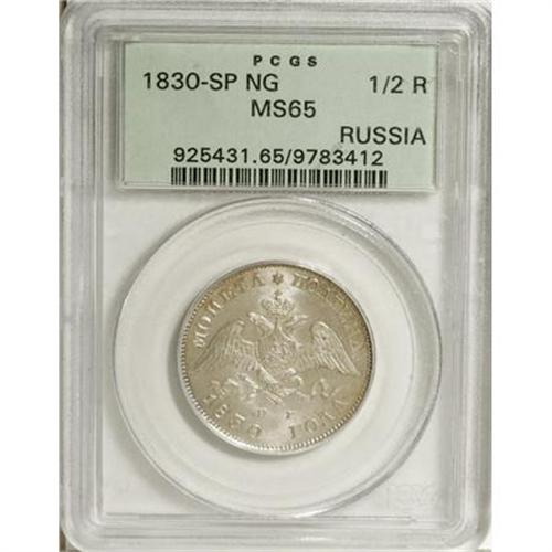 <B>Nicholas I. Poltina (1/2 Rouble) 1830 C??-H?,</B></I> Eagle with wings down and date/Inscription in wreath, KM160, UZD-1532, MS65 PCGS. Bitkin is not definite on the varieties of the 1830 Poltina. He has Bit-120 and Bit-121 both listed as variety 1.? (Narrow Crown). This is the Narrow Crown variety. Fully lustrous and bright with a hint of golden toning and no significant flaws. Extremely rare in this condition. <BR><BR><b>Shipping:</b> Coins & Currency (<a target="_blank" href="http://www.heritageauctions.com/common/shipping.php">view shipping information</a>)