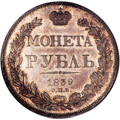 <B>Nicholas I. Proof Rouble 1839 C??-H?,</B></I> Crowned Imperial eagle/ Crown above legend, all in wreath, Bit-189, Uzd-1585, Proof 65 NGC. Argent-gray and russet toning with sharply formed devices and deeply mirrored fields. 1839 is a special year for collectors of Russian coinage. Proof examples of this prized year, especially the 1839 Rouble, have been highly sought-after for well over a century. We know of only two Proof 1839 Roubles sold in recent years. There may be more, but we can find no record of others. Both pieces that we can confirm were in the Superior sale of the Irving Goodman Collection in 1991. One piece was part of the 1839 Proof set, and we do not know the final disposition of that set. The piece that we offer was lot 920 of the Irving Goodman Collection. It was later sold to Dr. Robert Hesselgesser, and was sold as lot 5630, in the June 2000 sale of the Hesselgesser Collection. The rarest date Russian Rouble, in perhaps the finest known condition. An example for the finest collection. Est. 80,000-100,000<BR><I>From the Belle Glade Collection, Part Two.</B></I><BR><BR><b>Shipping:</b> Coins & Currency (<a target="_blank" href="http://www.heritageauctions.com/common/shipping.php">view shipping information</a>)
