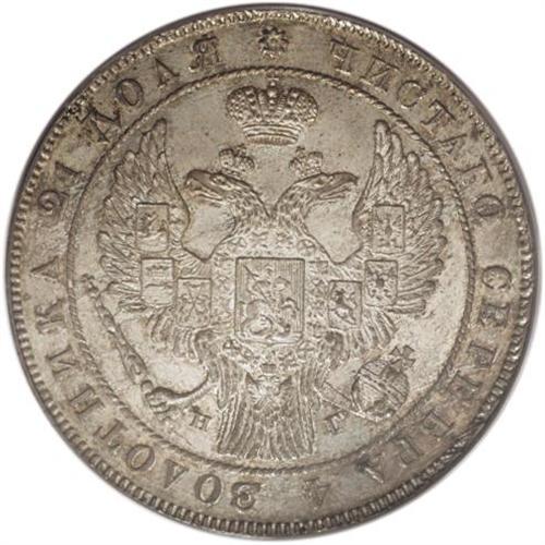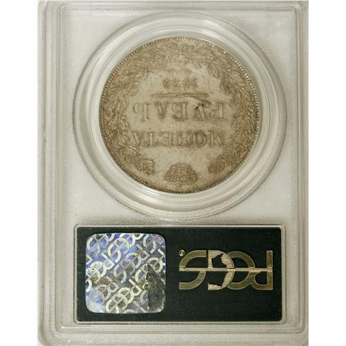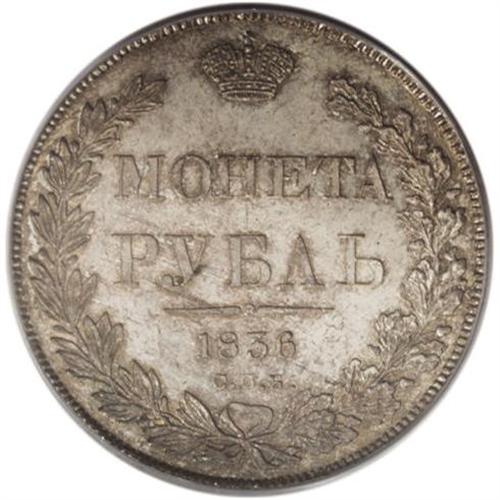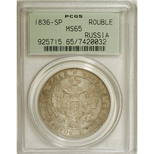 <B>Nicholas I. Rouble 1836 C??-H?,</B></I> Crowned Imperial eagle/ Crown above legend, all in wreath, Bit-177, Uzd-1567, MS65 PCGS. A wonderfully original Gem, with sharp definition and argent-gray toning with golden highlights over sparkling mint luster.<BR><I>From the Belle Glade Collection, Part Two.</B></I><BR><BR><b>Shipping:</b> Coins & Currency (<a target="_blank" href="http://www.heritageauctions.com/common/shipping.php">view shipping information</a>)