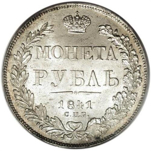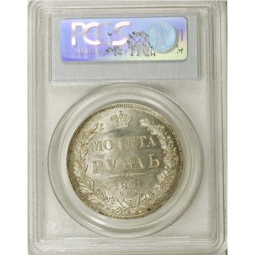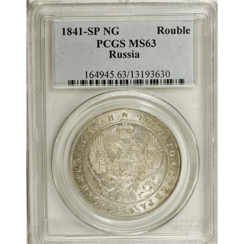 <B>Nicholas I. Rouble 1841 C??-H?,</B></I> Crowned Imperial eagle/ Crown above legend, all in wreath, Bit-192, Uzd-1597, MS63 PCGS. With the exception of one small area of the leaves on the reverse, the strike is bold, and the luster full and bright with only light abrasions.<BR><BR><b>Shipping:</b> Coins & Currency (<a target="_blank" href="http://www.heritageauctions.com/common/shipping.php">view shipping information</a>)