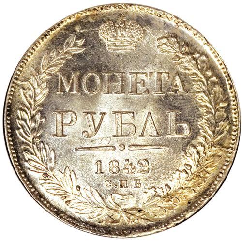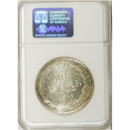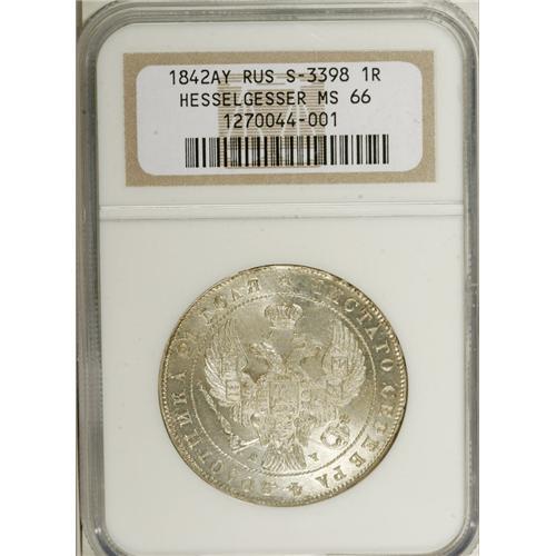 <B>Nicholas I. Rouble 1842 C??-A?,</B></I> Crowned Imperial eagle/ Crown above legend, all in wreath, Bit-196, Uzd-1603, MS66 NGC. Superb, blazing mint luster with pristine surfaces and spectacular eye-appeal. There are so many other wonderful adjectives that could be used to describe this piece, but there are many more incredible coins to come in this amazing collection, so we'll save some for those coins. Ex: Hesselgesser Collection.<BR><I>From the Belle Glade Collection, Part Two.</B></I><BR><BR><b>Shipping:</b> Coins & Currency (<a target="_blank" href="http://www.heritageauctions.com/common/shipping.php">view shipping information</a>)