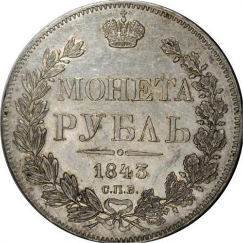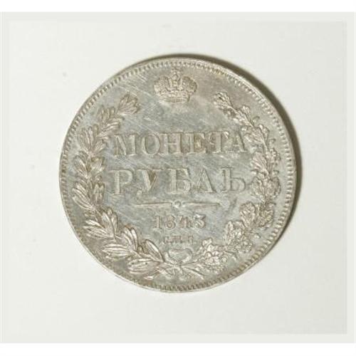 <B>Nicholas I. Rouble 1843 C??-A?,</B></I> Imperial eagle/Date and value in wreath, Bit-202, lustrous AU. Well struck with light golden toning. <BR><BR><b>Shipping:</b> Coins & Currency (<a target="_blank" href="http://www.heritageauctions.com/common/shipping.php">view shipping information</a>)