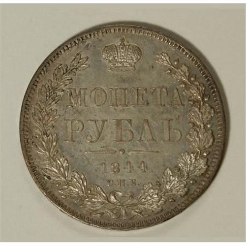 <B>Nicholas I. Rouble 1844 C??-??,</B></I> Imperial eagle/Date and value in wreath, Bit-205, lightly cleaned XF-AU with a touch of golden toning and noticeable remaining luster. <BR><BR><b>Shipping:</b> Coins & Currency (<a target="_blank" href="http://www.heritageauctions.com/common/shipping.php">view shipping information</a>)