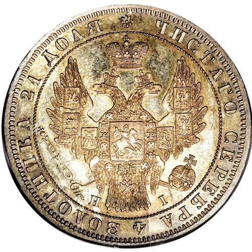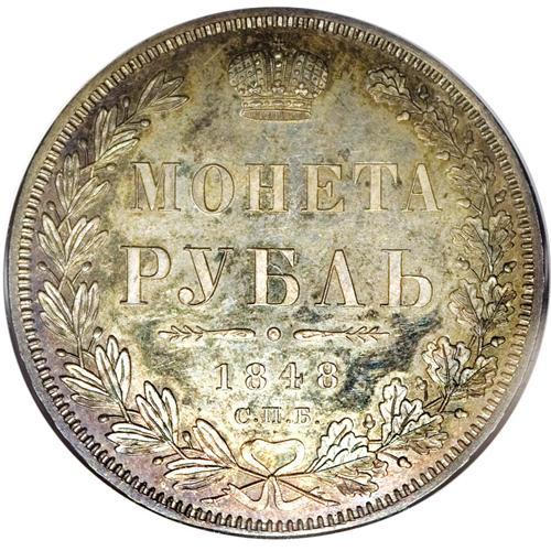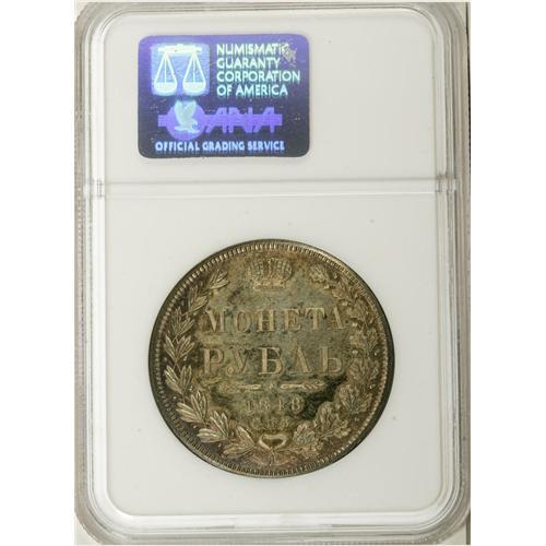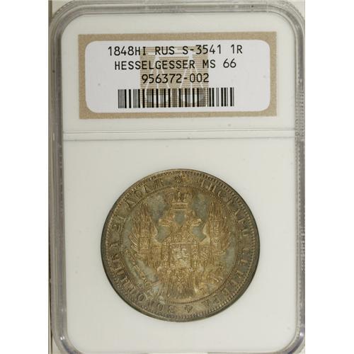 <B>Nicholas I. Rouble 1848 C??-HI,</B></I> Crowned Imperial eagle/ Crown above legend, all in wreath, Bit-218, Uzd-1659, MS66 NGC. Superbly struck with lovely olive and gold toning over pristine surfaces with prooflike fields. Another incredible Rouble with superb eye-appeal. Ex: Hesselgesser Collection.<BR><I>From the Belle Glade Collection, Part Two.</B></I><BR><BR><b>Shipping:</b> Coins & Currency (<a target="_blank" href="http://www.heritageauctions.com/common/shipping.php">view shipping information</a>)