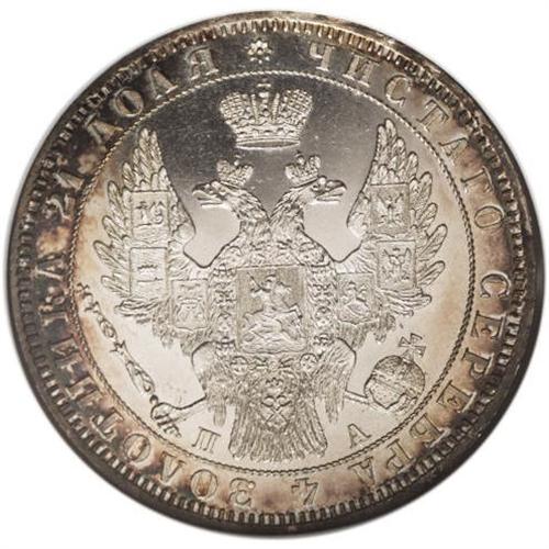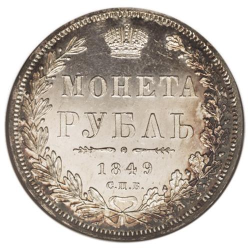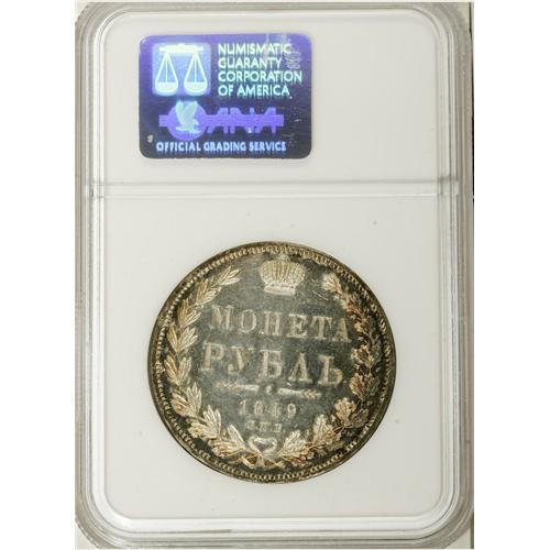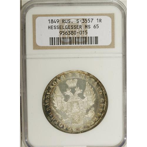 <B>Nicholas I. Rouble 1849 C??-?A,</B></I> Crowned Imperial eagle/ Crown above legend, all in wreath, Bit-224, Uzd-1668, MS65 NGC. Fully mirror-like fields with frosted devices and a bold strike. The imperfections are small, and few, and the central areas white with bands of charcoal toning around the peripheries. This piece has all of the characteristics of a Proof coin, and we feel that this piece needs to be carefully examined. Ex: Hesselgesser. <BR><I>From the Belle Glade Collection, Part Two.</B></I><BR><BR><b>Shipping:</b> Coins & Currency (<a target="_blank" href="http://www.heritageauctions.com/common/shipping.php">view shipping information</a>)