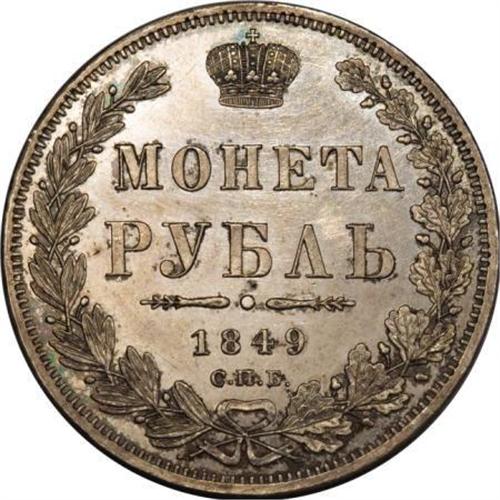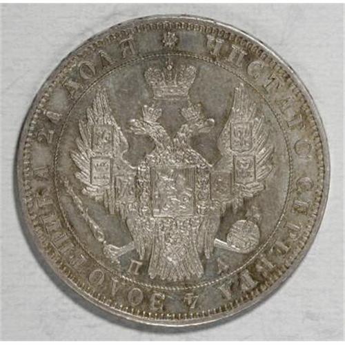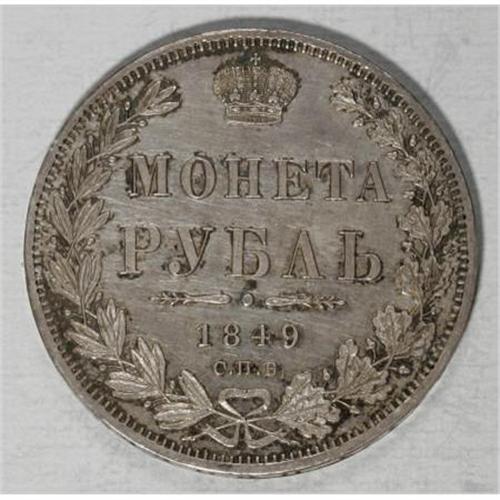 <B>Nicholas I. Rouble 1849 C??-?A,</B></I> Imperial eagle/Date and value in wreath, Bit-219, superbly struck AU-UNC. Lustrous and brilliant with prooflike surfaces and light hairlines keeping us from calling this full UNC. <BR><BR><b>Shipping:</b> Coins & Currency (<a target="_blank" href="http://www.heritageauctions.com/common/shipping.php">view shipping information</a>)