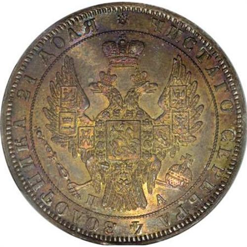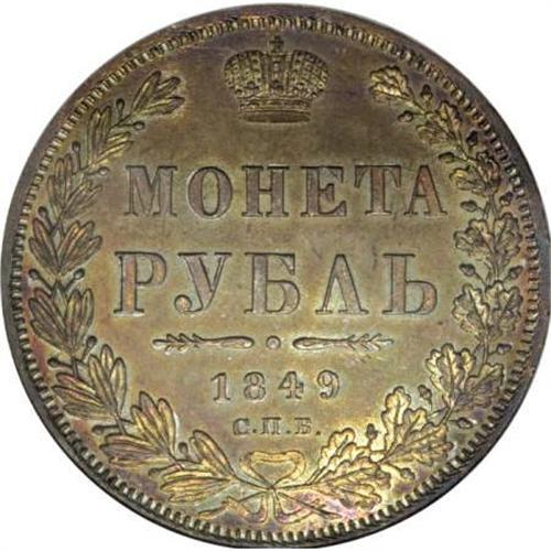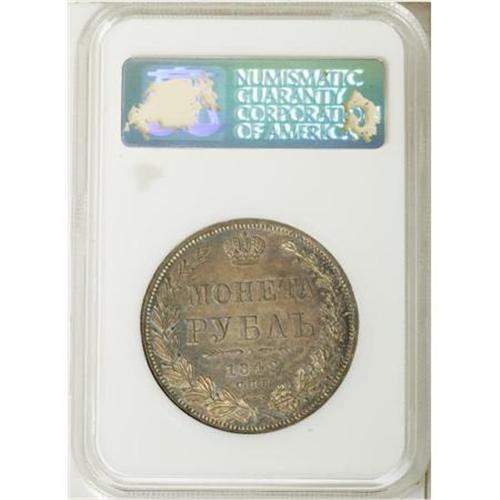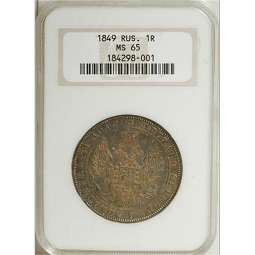 <B>Nicholas I. Rouble 1849 C??-?A,</B></I> Imperial eagle/Date and value in wreath, Bit-219, MS65 NGC. Sharply toned with attractive greenish-gold patina. <BR><BR><b>Shipping:</b> Coins & Currency (<a target="_blank" href="http://www.heritageauctions.com/common/shipping.php">view shipping information</a>)