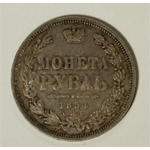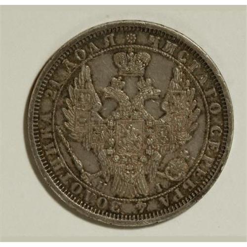 <B>Nicholas I. Rouble 1854 C??-HI,</B></I> Imperial eagle/Date and value in wreath, Bit-234, well struck XF with light gray toning and considerable remaining luster. <BR><BR><b>Shipping:</b> Coins & Currency (<a target="_blank" href="http://www.heritageauctions.com/common/shipping.php">view shipping information</a>)