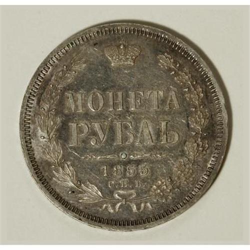 <B>Nicholas I. Rouble 1855 C??-?A,</B></I> Imperial eagle/Date and value in wreath, Bit-235, sharply struck AU-UNC with a fully prooflike reverse. Both sides exhibit mottled, light gray toning and there is a small rim bump at 8 o’clock on the obverse. <BR><BR><b>Shipping:</b> Coins & Currency (<a target="_blank" href="http://www.heritageauctions.com/common/shipping.php">view shipping information</a>)