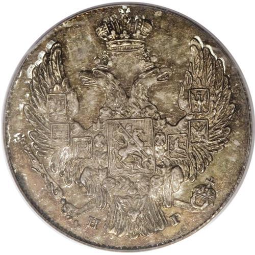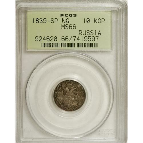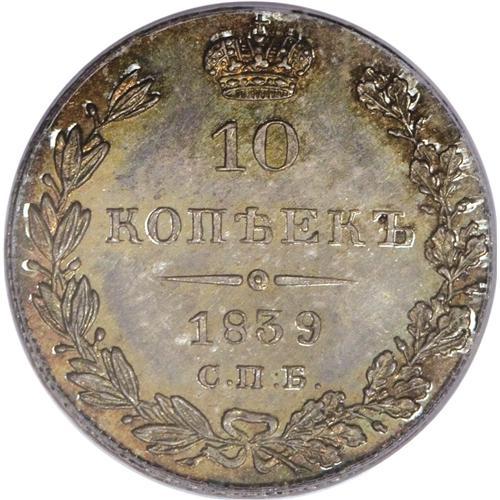 <B>Nicholas I. Silver 10 Kopecks 1839 C??-H?,</B></I> Crowned Imperial eagle/Crowned date and value within wreath, Bit-355, Uzd-1589, MS66 NGC. Boldly struck and superbly toned with prooflike surfaces and a lovely overall appearance.<BR><I>From the Belle Glade Collection, Part Two.</B></I><BR><BR><b>Shipping:</b> Coins & Currency (<a target="_blank" href="http://www.heritageauctions.com/common/shipping.php">view shipping information</a>)