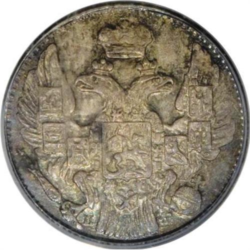 <B>Nicholas I. Silver 5 Kopecks 1834 C??-H?,</B></I> Eagle with wings up Date and value in wreath, Bit-387, MS64 PCGS. Mottled gray toning with an average strike. <BR><BR><b>Shipping:</b> Coins & Currency (<a target="_blank" href="http://www.heritageauctions.com/common/shipping.php">view shipping information</a>)