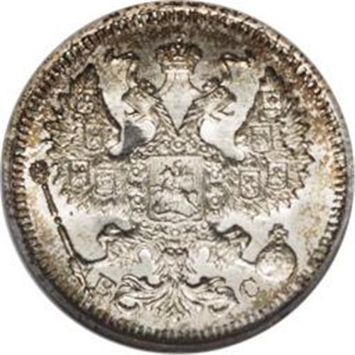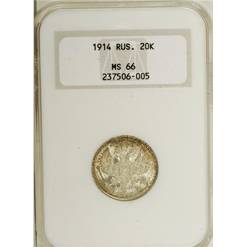 <B>Nicholas II. 20 Kopecks 1914 C??-BC,</B></I> Crowned Imperial eagle/Crowned date and value in wreath, Bit-116, Uzd-2209, MS66 NGC. Full frosty mint luster with appealing sea-green and russet patina. The surfaces appear flawless, and one wonders what the graders saw to limit the grade on this amazing example to MS66.<BR><I>From the Belle Glade Collection, Part Two.</B></I><BR><BR><b>Shipping:</b> Coins & Currency (<a target="_blank" href="http://www.heritageauctions.com/common/shipping.php">view shipping information</a>)