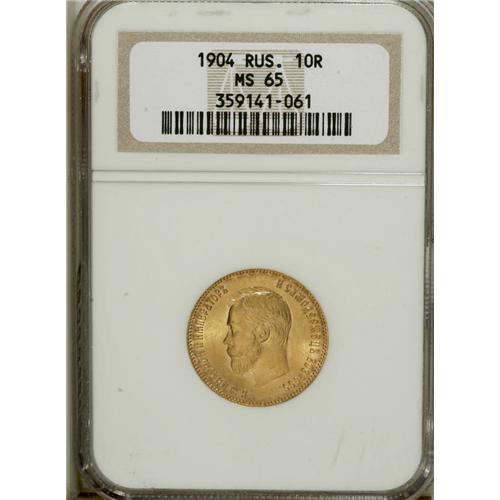 <B>Nicholas II. Gold 10 Roubles 1904 A?,</B></I> Bust left/Imperial eagle with date and value, Bit-12, F-179, MS65 NGC. Brilliant luster with a few tiny marks.<BR><BR><b>Shipping:</b> Coins & Currency (<a target="_blank" href="http://www.heritageauctions.com/common/shipping.php">view shipping information</a>)